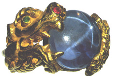 Il mitico dragone che si mangia la coda, e nel frattempo inghiotte ed espelle l’ Uovo Cosmogonico, fonte e termine di tutte le stelle. Uno splendido zaffiro stellato interpreta l’ Uovo Cosmogonico, e la struttura del dragone permette una ampia visione laterale della gemma