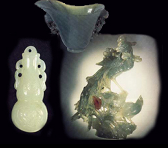 Ciondoli in giada di diverso colore, raffiguranti giochi floreali, simboli magici, dragoni. Da notare come la pietra, che ha una durezza notevole, riesca ad essere interpretata come qualcosa di morbido.