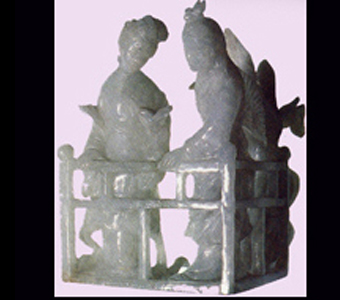 Statuina color lavanda, con coppia al balcone. Il balcone, nelle società in cui il retaggio delle caste sociali è ancora presente, ha una simbologia particolare: la famiglia nobile guarda un poco dall’alto; è protetta, ma non sta rinchiusa nei suoi alloggi.