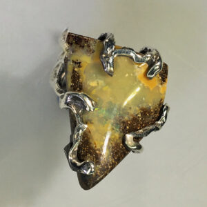 Taglio: Generalmente a cabochon, sovente con forme bizzarre che seguono la forma del nodulo originario. Il fondo del cabochon può essere glabro o lucido, a seconda della fantasia di chi lo ha lavorato. In certi casi il processo di opalizzazione è stato accompagnato dal processo di fossilizzazione, ed esistono quindi conchiglie, granchi, ossa e legno fossile opalizzato di grande suggestione. In questi casi, per quanto possibile, si cerca di evidenziare sia l’aspetto “opale”, sia l’aspetto “fossile”.
