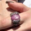 La plasticità del metallo viene confusa dalle scaglie del drago; la rigidità della pietra viene celata dal taglio a cabochon. Questo rubino stellato, con i suoi luminosi raggi bianchi di luce che si stagliano sulla pietra opaca, è propprio un grumo di energia che sorge da chissà dove, ma che colpisce la tua consapevolezza e, in qualche modo, ti indica la via :). Questo anello può essere indossato su qualunque dito, grazie anche all'ingegneria del gambo. L'indice è un dito particolarmente indicato in quanto permette una scenografica esposizione del volto di questo bel drago.