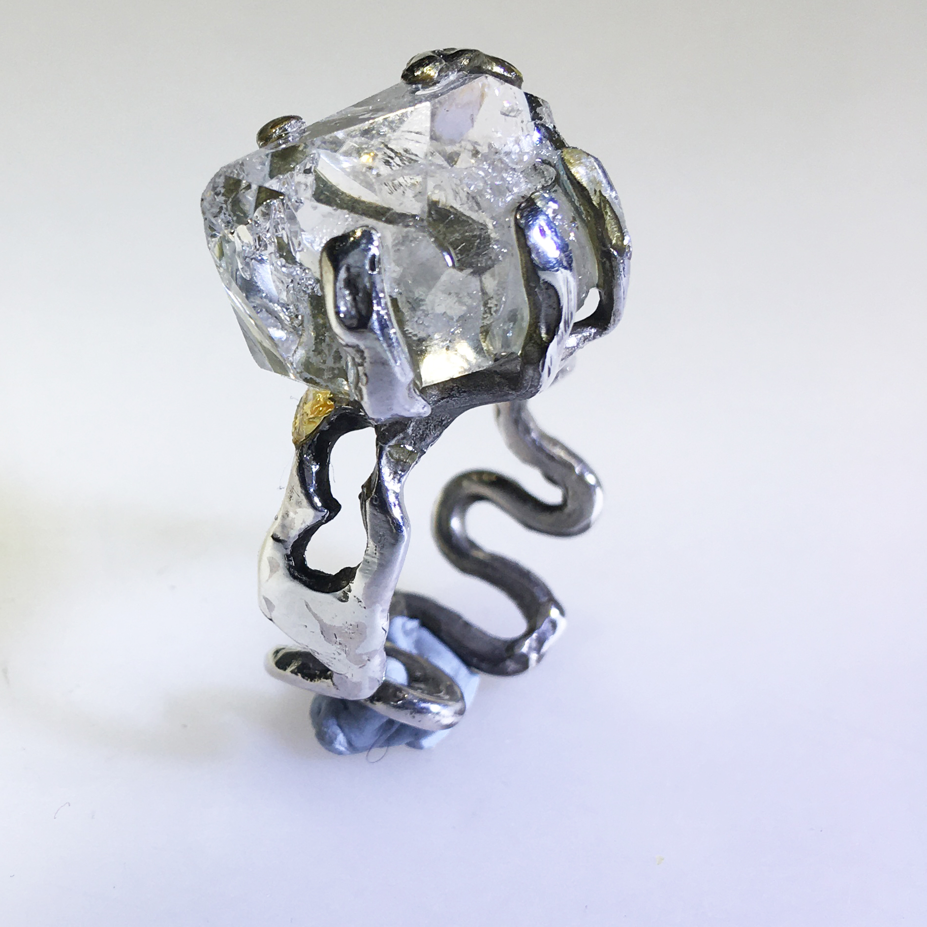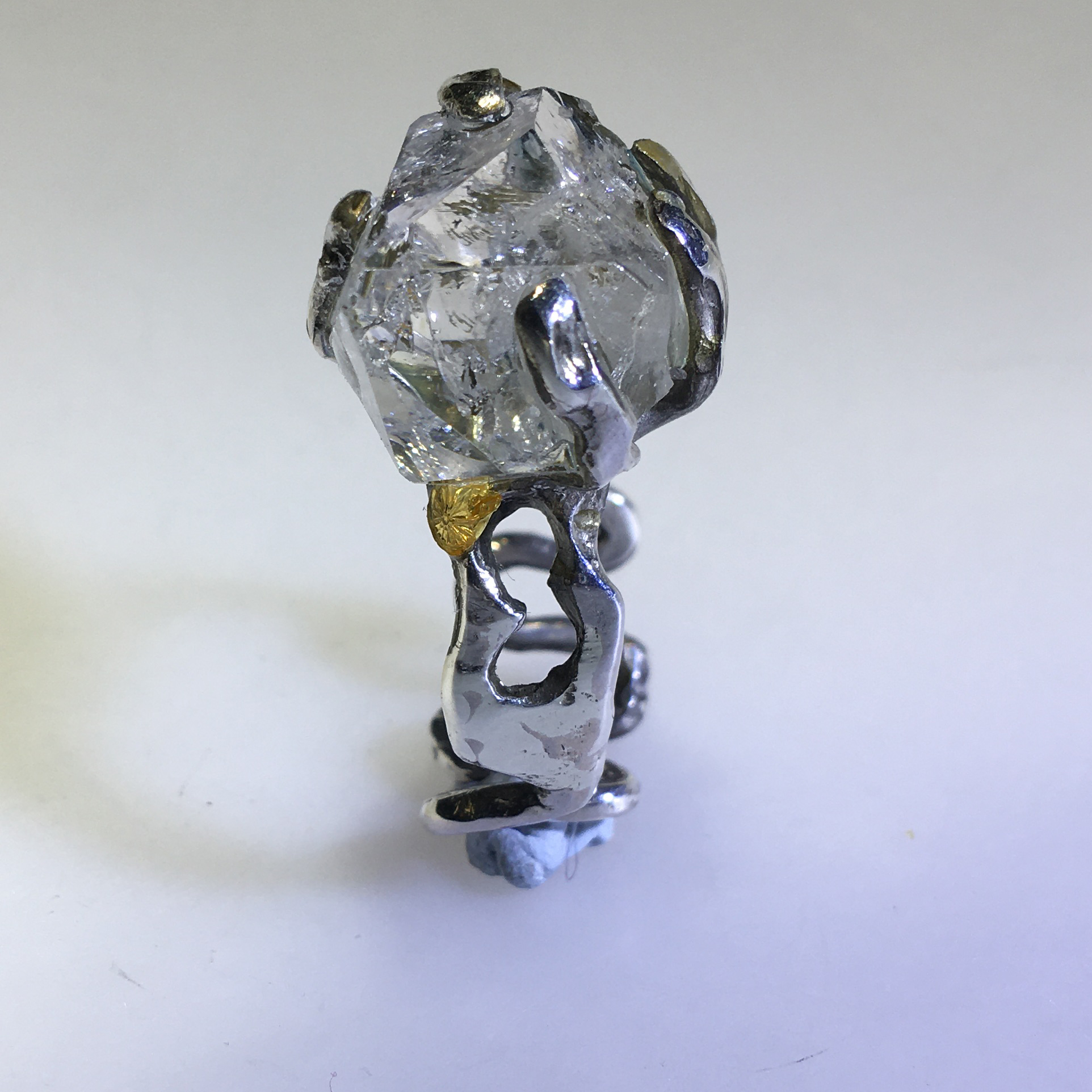 La struttura in metallo dell’anello è quella della radice rovesciata. È l’anima femminile del gioiello. Si abbraccia al dito, abbraccia la pietra, è tutta un abbraccio.