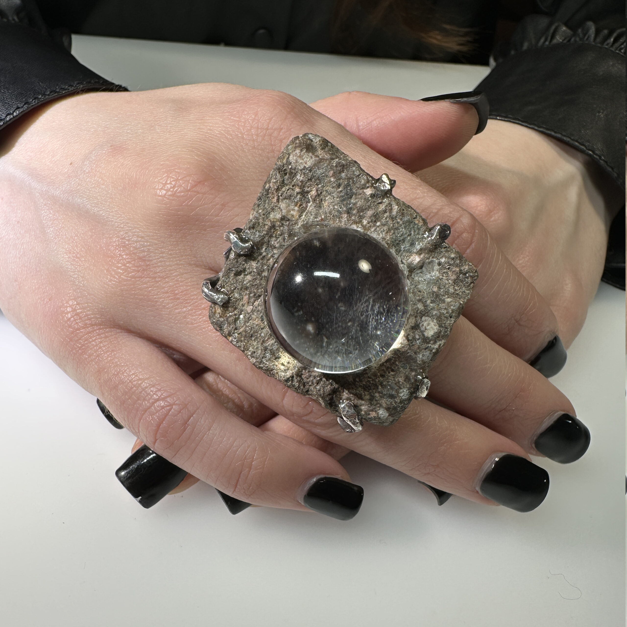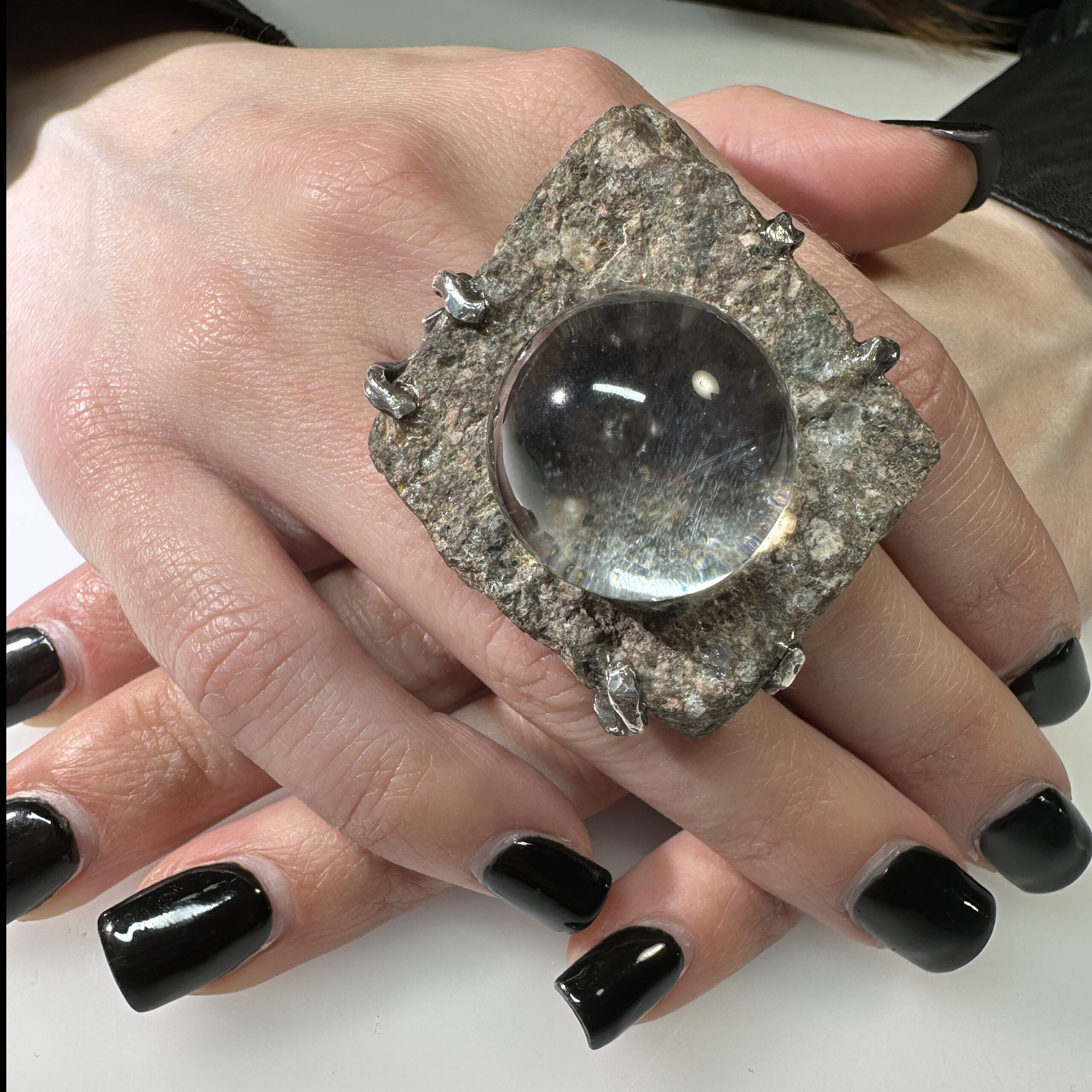 Quadrato e tondo, cubo e sfera, opaco e trasparente, ruvido e lucido, colorato e incolore, massivo e cristallino, utile e decorativo… e si potrebbe continuare. I nostri gioielli hanno sempre due polarità: un po’ di sorriso, e un po’ di cultura. Il senso di sorriso, in questo anello, è così evidente, che passiamo subito all’altro aspetto. Molte complementarietà sono una evidente ricerca di totalità. La terra che vuole comunicare con il Cielo, e il Cielo che lancia messaggi verso la Terra. Questo, le due pietre. Ma tutta la struttura di pietra è tenuta assieme dai rami di un albero che, legando le sue radici al dito, protende i suoi rami su tutto l’elemento terreno, lambendo il cielo. La pietra opaca è la parte calpestata di un san pietrino. Molta gente ha fatto molta strada su di esso, è giusto che ora faccia un po’ di strada assieme alla gente. La sfera di cristallo, tradizionalmente, è intrisa di magia e mistero. I giochi di luce e le immagini che si possono intravvedere al suo interno, ci fanno venire un po’ di nostalgia per i tempi in cui, nel bosco, era normale vedere caprioli che scappavano dai lupi, mentre la sciamana del villaggio frugava il sottobosco in cerca di funghi ed erbe sacre. Nostalgia per un mondo magico, significa apertura verso il mistero e il non conosciuto. Significa disponibilità alla comunicazione con l’ignoto. Significa apertura verso il non conosciuto, il non conoscibile, l’arte, i grandi Perché.