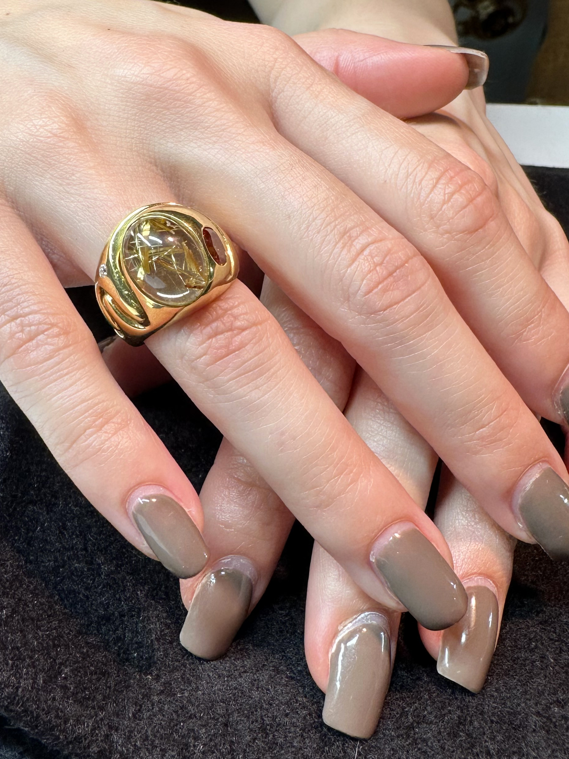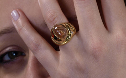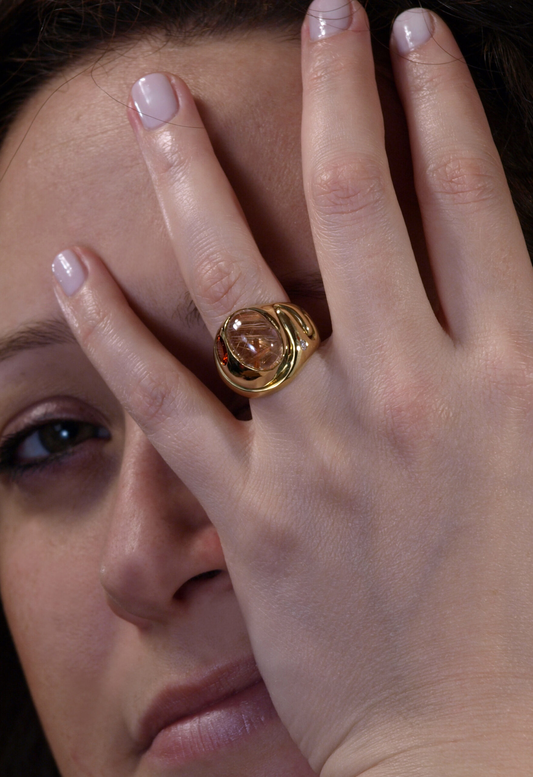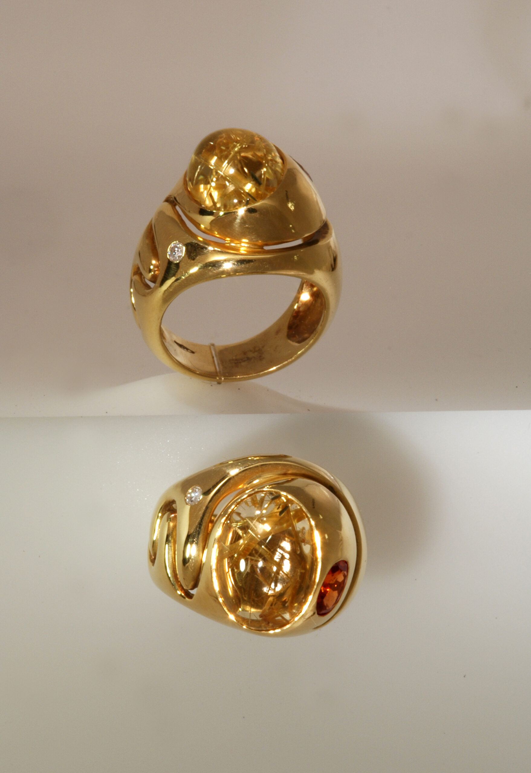 Un limpido cabochon di quarzo racchiude assurdi e bellissimi cristalli di rutilo, raggi di luce dorata. Un granato essonite arancione, caldo, palpitante e vivo, sembra trarre la sua energia dalla luce di quei raggi. Un minuscolo brillante ci ricorda che basta una piccola luce per illuminare un intero orizzonte.