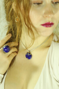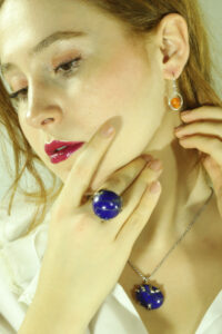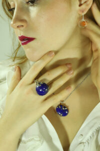 La struttura in metallo è quella della radice rovesciata. È l’anima femminile del gioiello. Si abbraccia alla persona, abbraccia la pietra, è tutta un abbraccio.