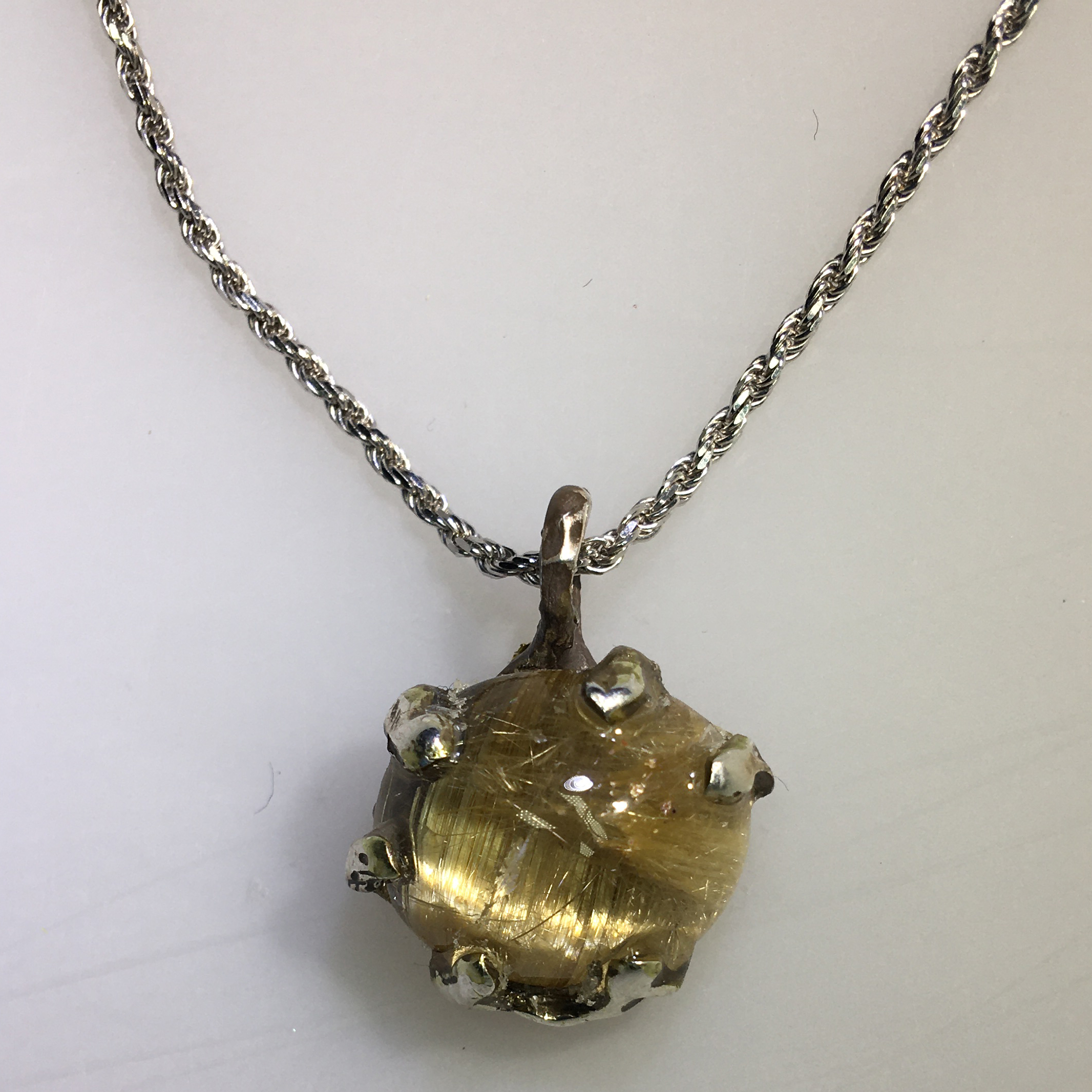 QUARZO RUTILATO: Fra i mille modi di esprimersi del quarzo, gli esemplari con inclusioni aghiformi di cristalli di rutilo si impongono per la loro assurda bellezza. Ma come hanno fatto a infilarsi lì dentro? Questa istintiva curiosità stimola la fantasia, e il colore delle pagliuzze dorate mette allegria, perché ci ricorda il sole e i campi di grano.