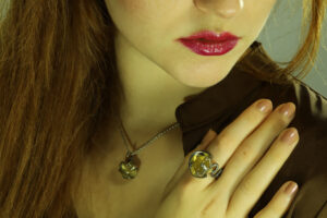 La pietra è durezza, colore, luce, energia. È l’anima maschile del gioiello. Se non fosse per la radice che la trattiene, continuerebbe a rotolare nel fiume, o languirebbe nel buio della montagna. Ma, ora, grazie al “Ramo di Fuoco”, può inebriarsi di luce.