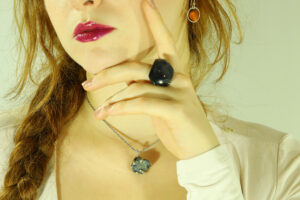 La pietra è durezza, colore, luce, energia. È l’anima maschile del gioiello. Se non fosse per la radice che la trattiene, continuerebbe a rotolare nel fiume, o languirebbe nel buio della montagna. Ma, ora, grazie al “Ramo di Fuoco”, può inebriarsi di luce.