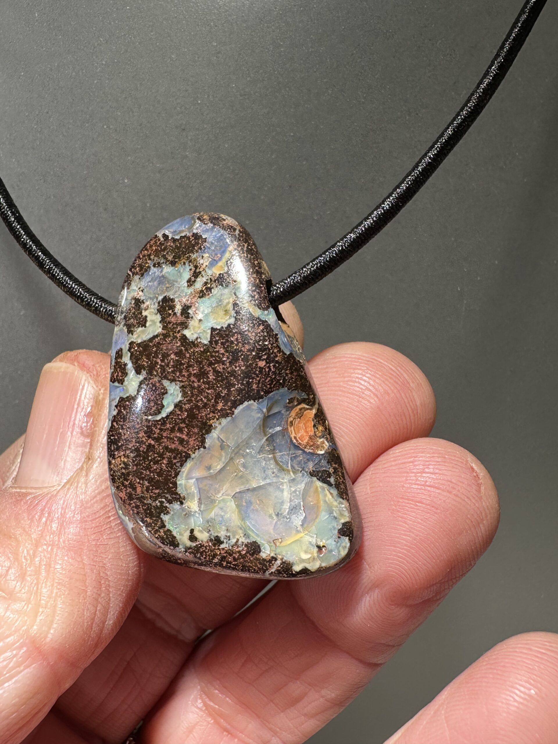 Descrizione: ciondolo di prezioso opale lavorato con colori blu/verdi liquidi su matrice. Treccia elastica nera regolabile.