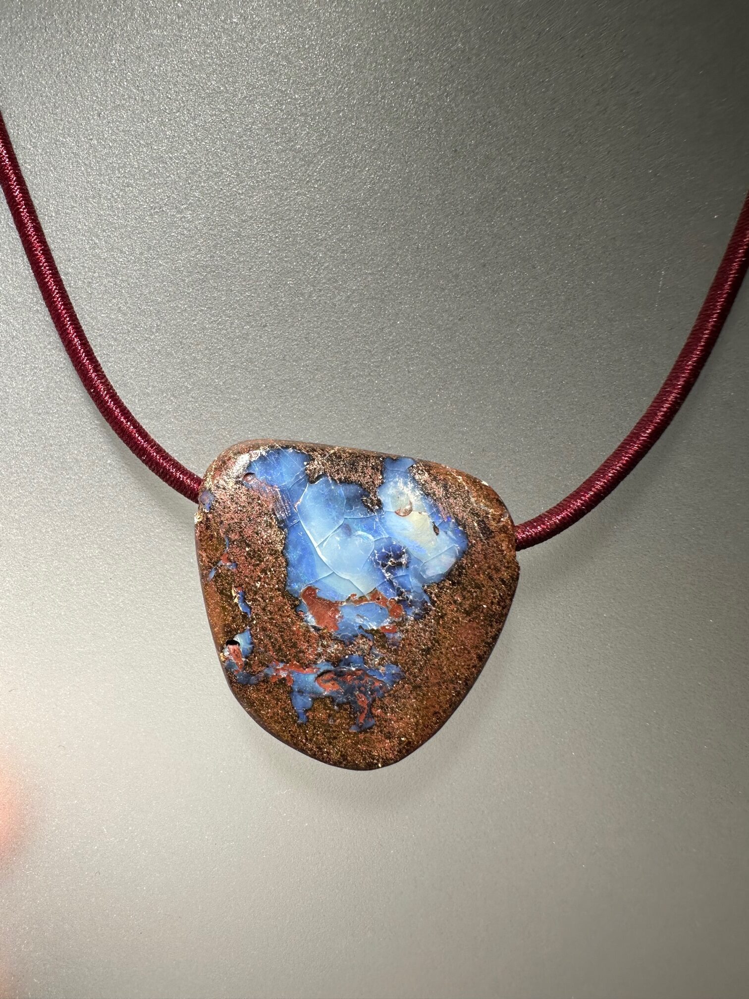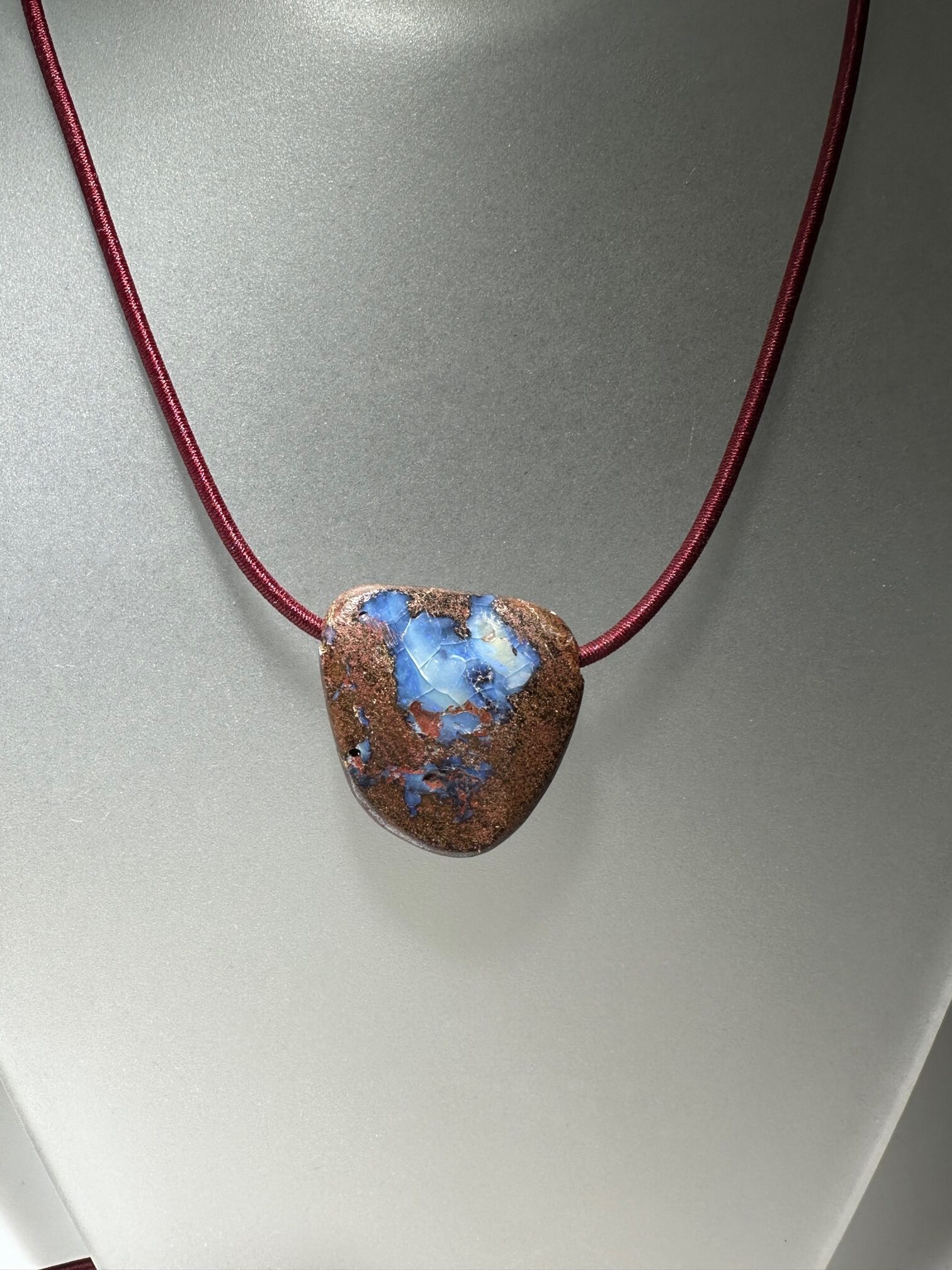 Descrizione: ciondolo di prezioso opale lavorato con colori blu liquidi su matrice. Treccia elastica nera regolabile.