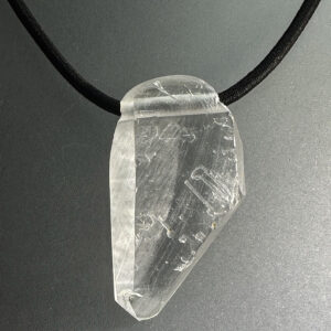 Descrizione: ciondolo di quarzo (cristallo scenico ossidato in parte superficialmente/trasparente in parte). Treccia elastica nera (disponibile anche bordoaux) regolabile.