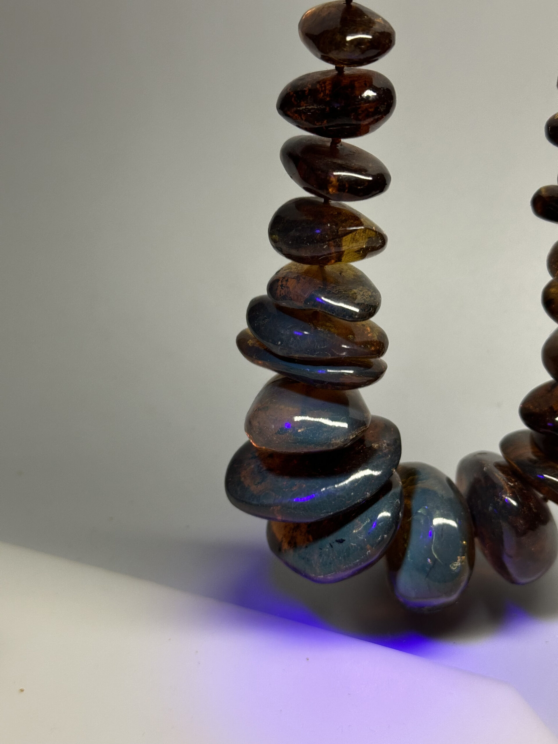 Collana ambra dominicana naturale con cangianze di colore verde/blu g135 con chiusura in oro 750%