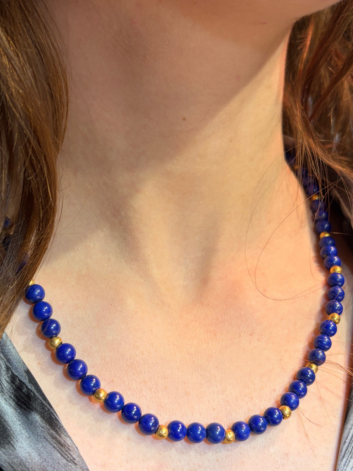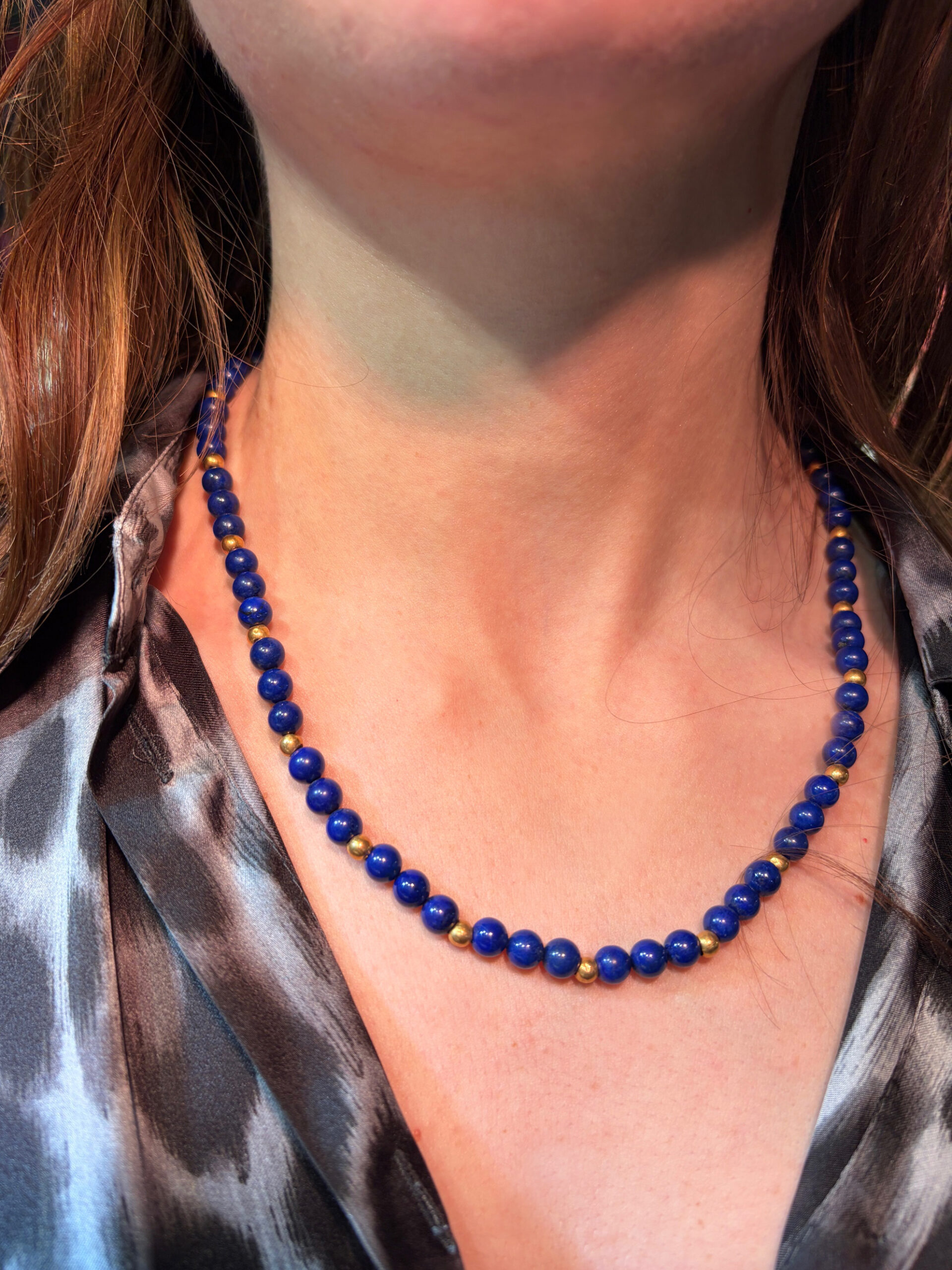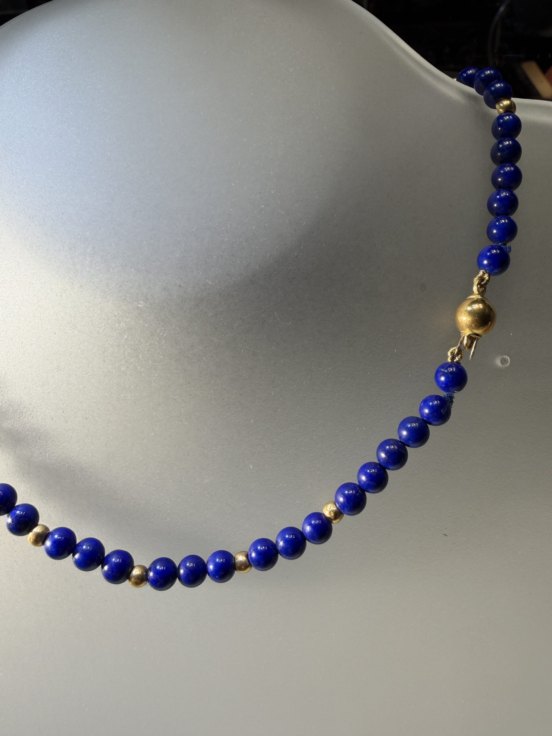Collana lapislazzuli naturale a sfere del diametro di 6mm dal colore blu intenso omogeneo. Inclusioni: tipiche della specie (cristalli di pirite e rade macchie di calcite). Lunghezza totale 47cm, chiusura in oro 750 e n19 intercalari a forma di sfera del diametro di 4mm in oro 750. Lapislazzuli provenienza Afghanistan di ottima qualità.