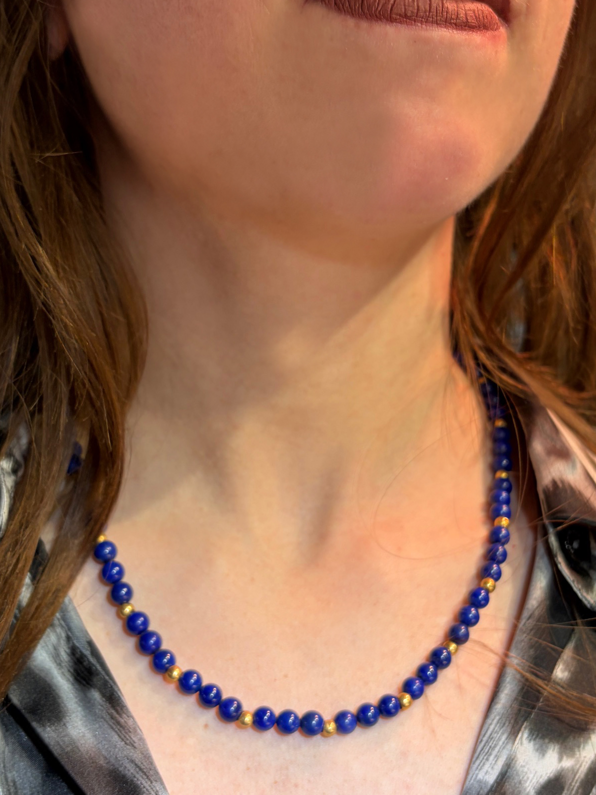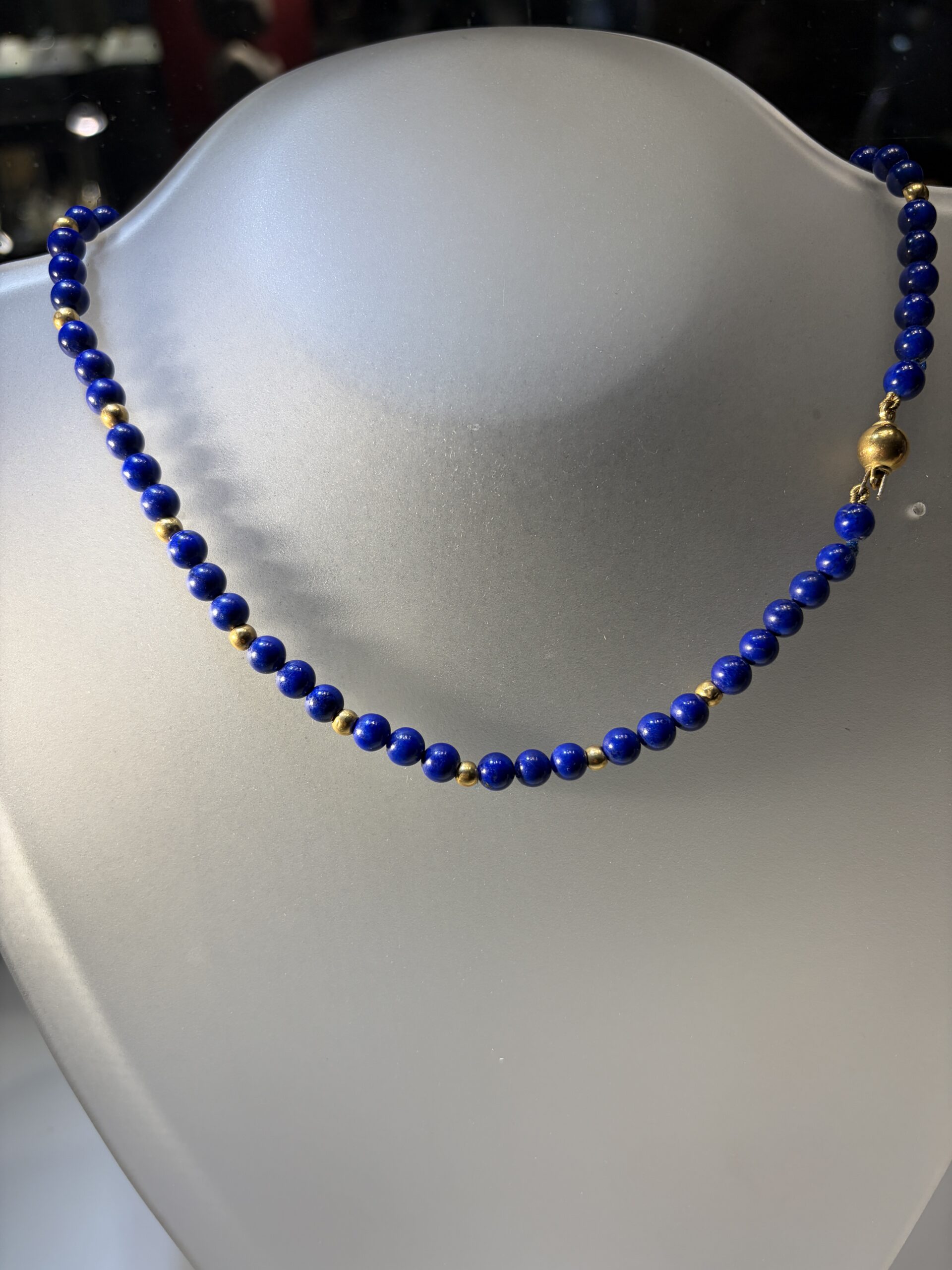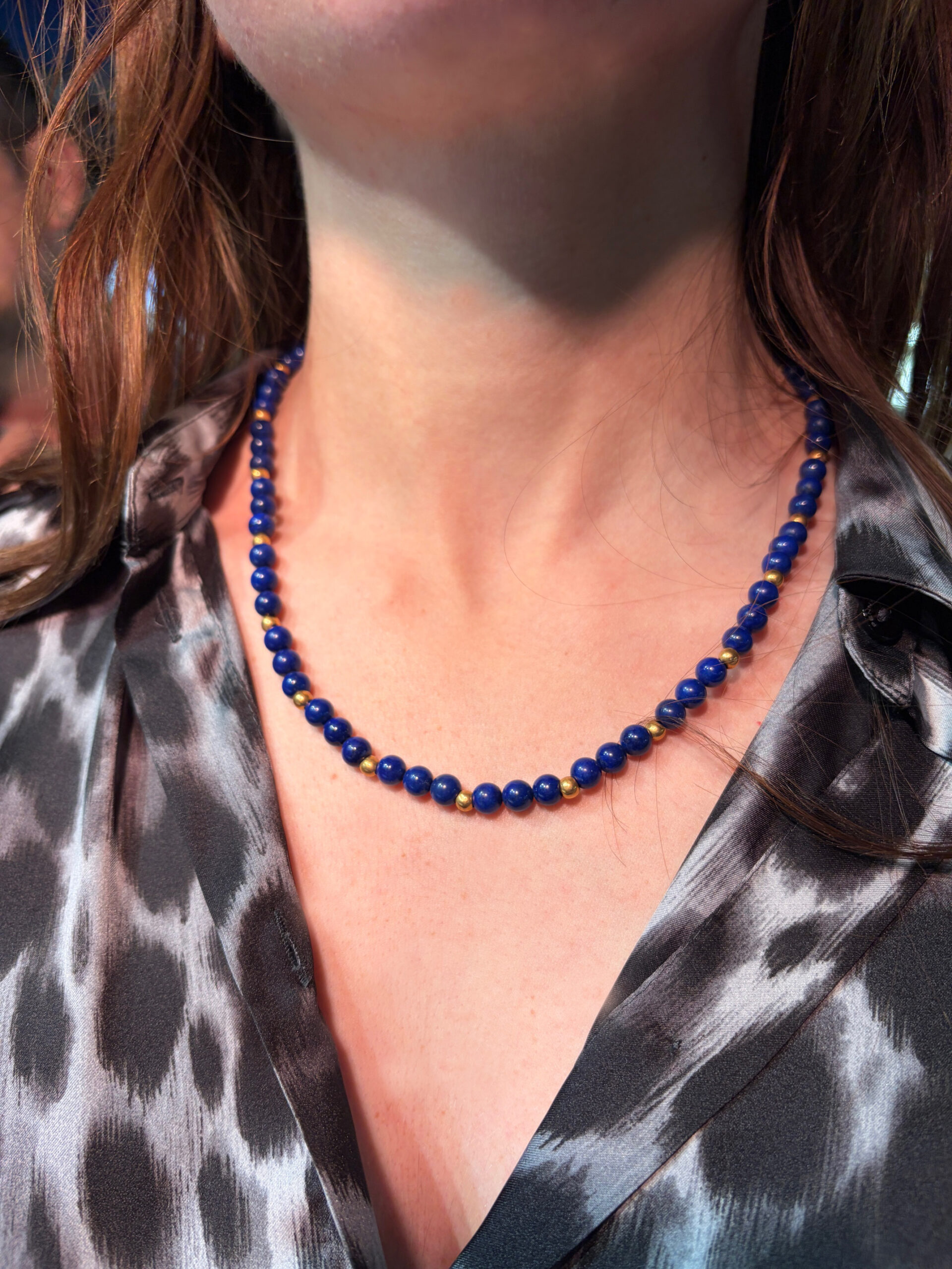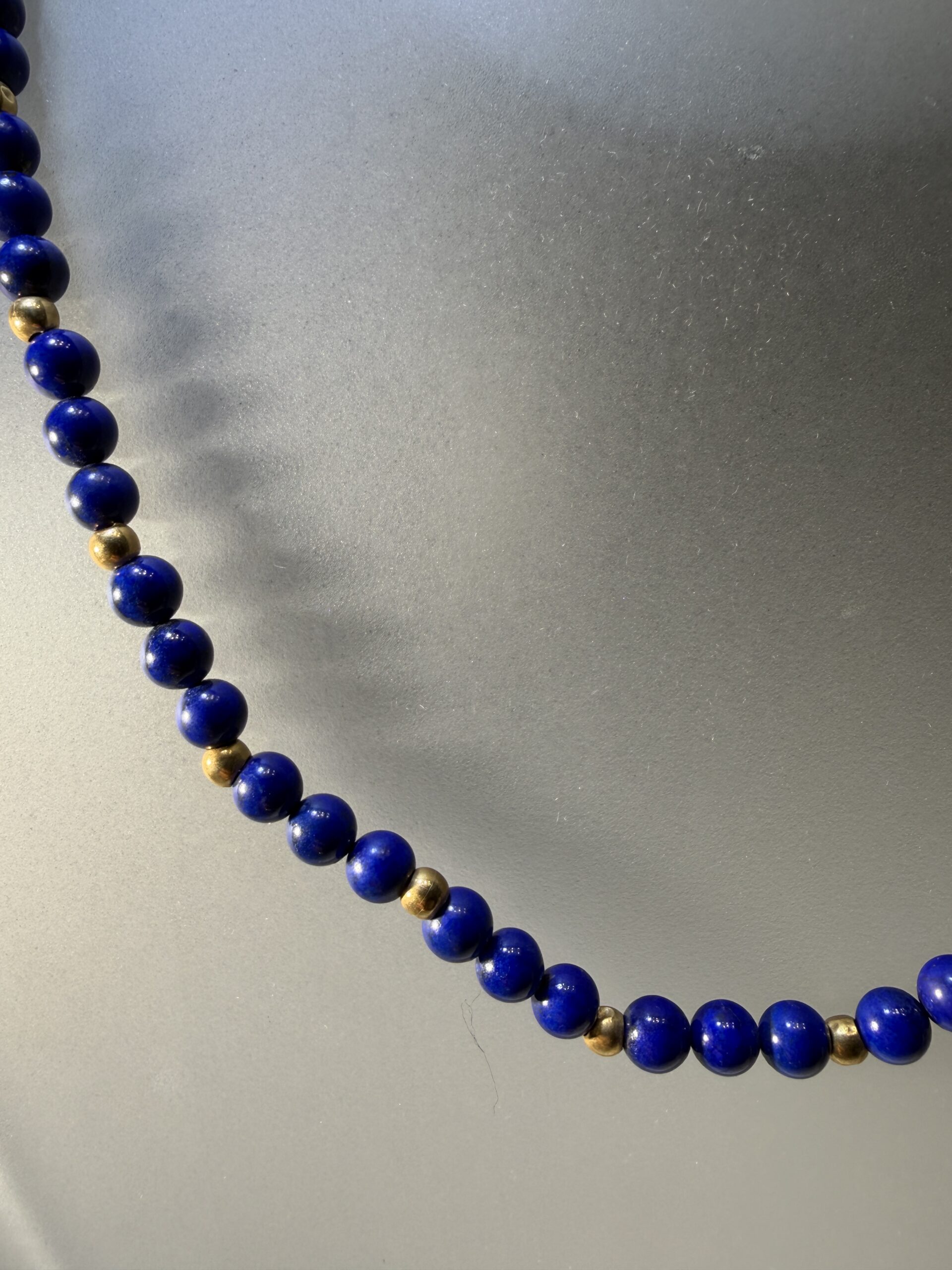 Collana lapislazzuli naturale a sfere del diametro di 6mm dal colore blu intenso omogeneo. Inclusioni: tipiche della specie (cristalli di pirite e rade macchie di calcite). Lunghezza totale 47cm, chiusura in oro 750 e n19 intercalari a forma di sfera del diametro di 4mm in oro 750. Lapislazzuli provenienza Afghanistan di ottima qualità.