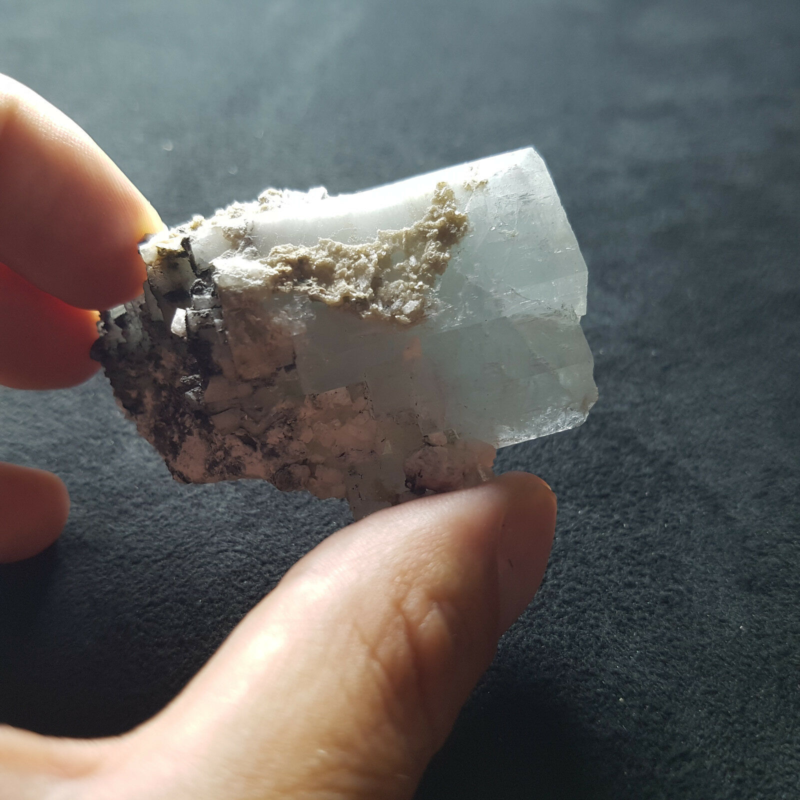 Descrizione: cristalli subedrali lievemente azzurri terminati in concrescimento parallelo, traslucidi, con matrice