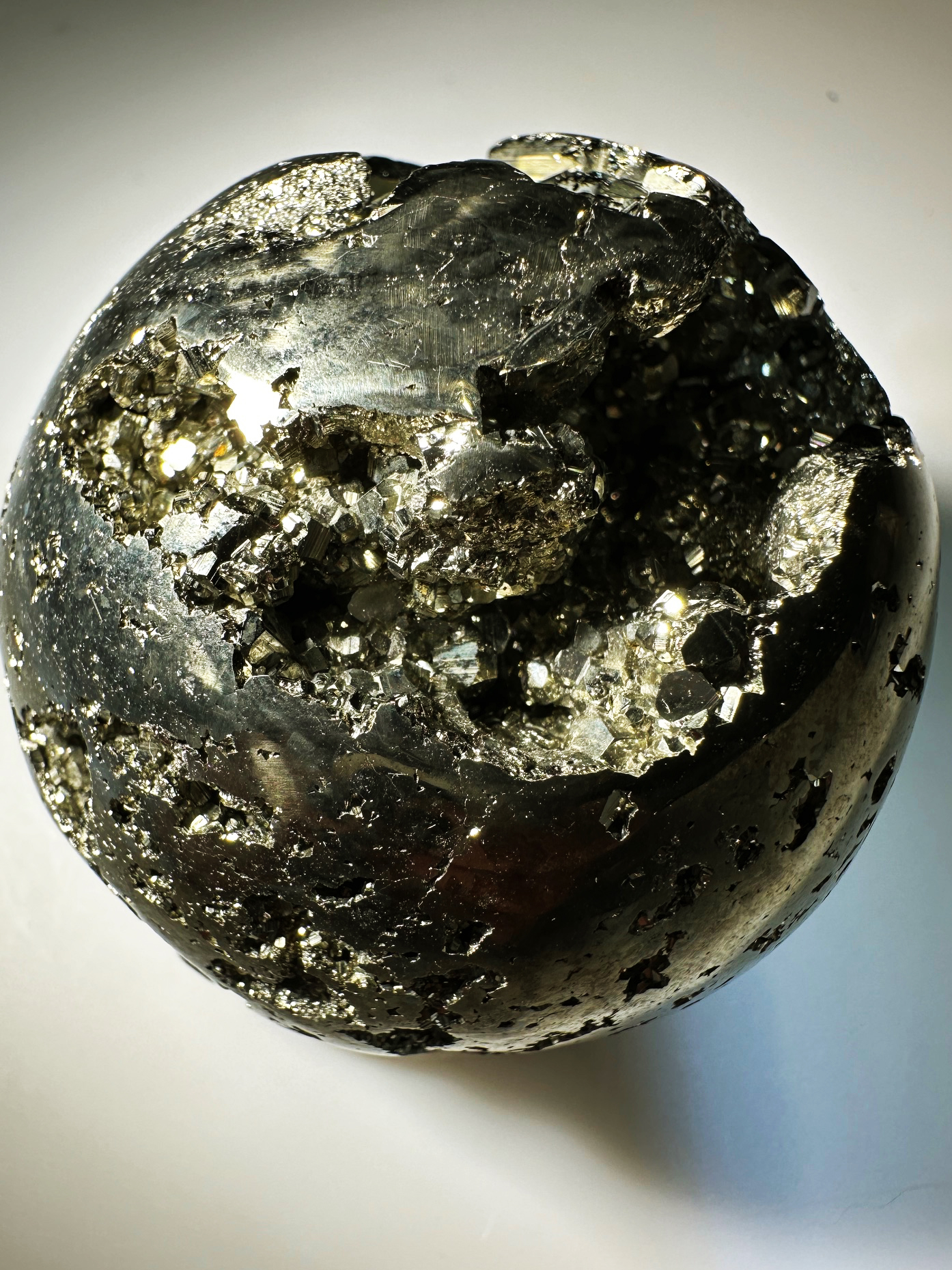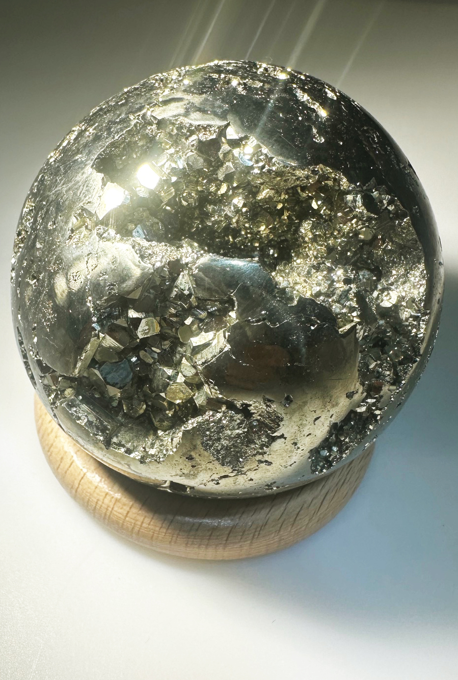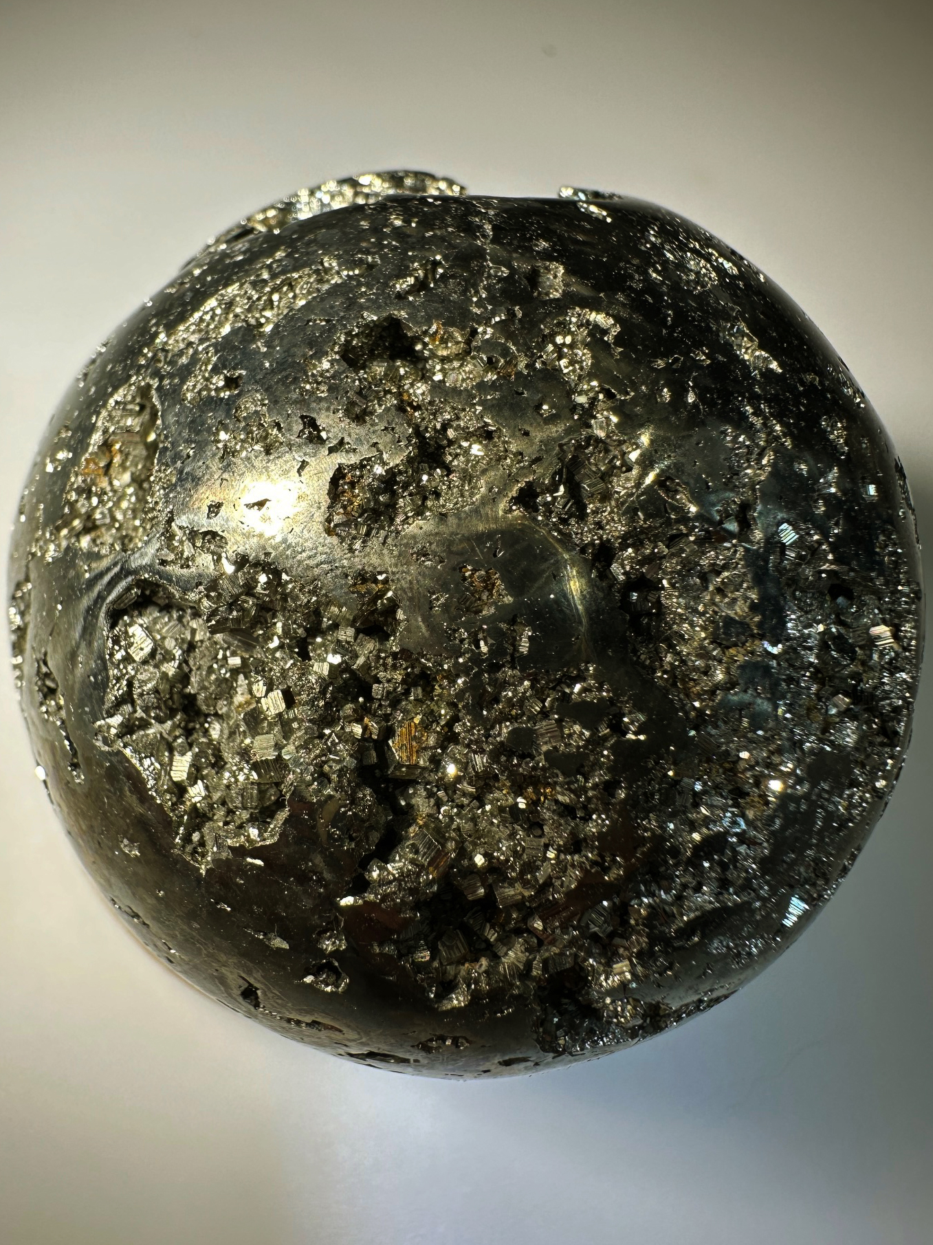 Descrizione: pirite lavorata a sfera, cristalli lucentissimi e ben formati
