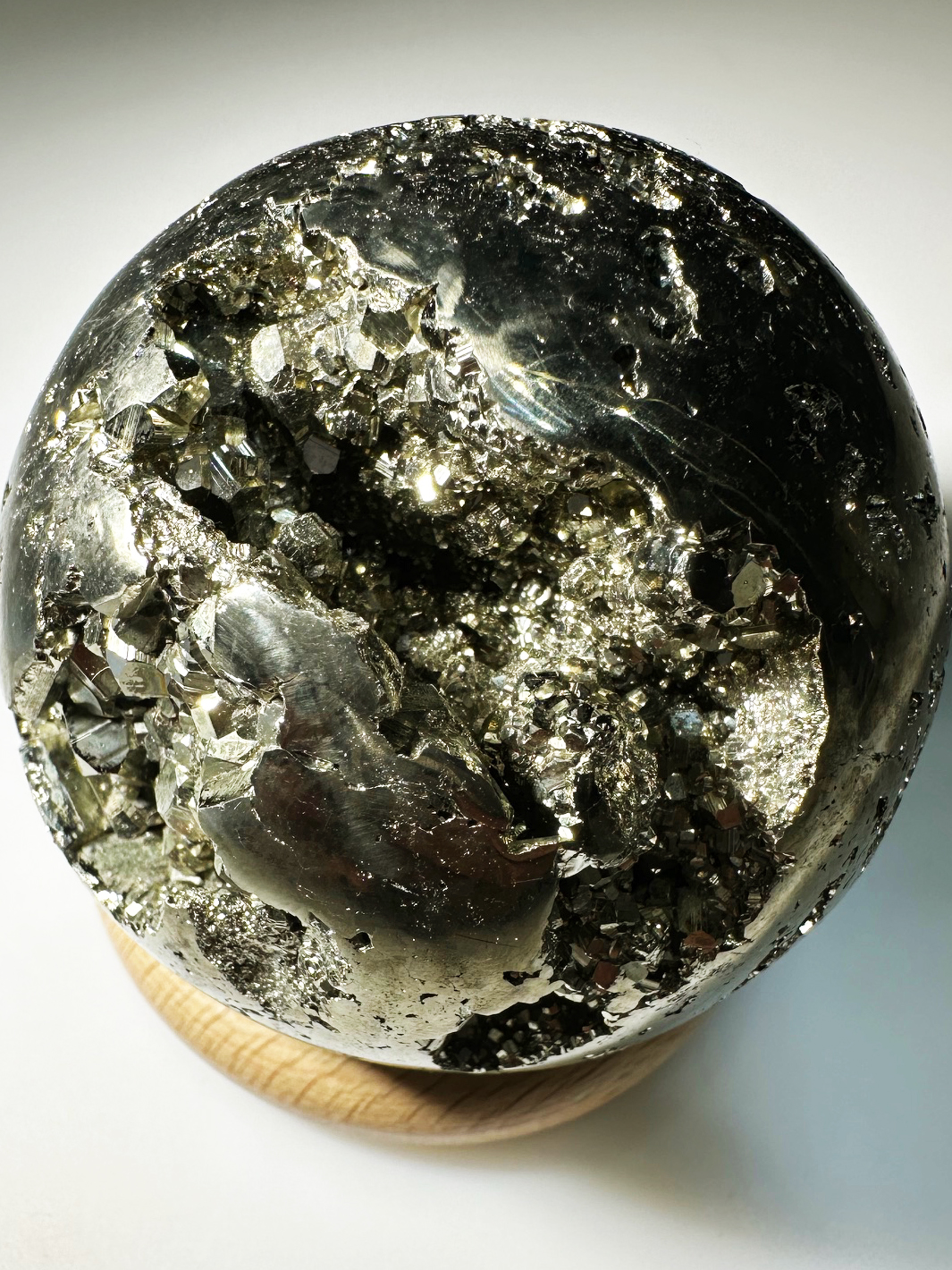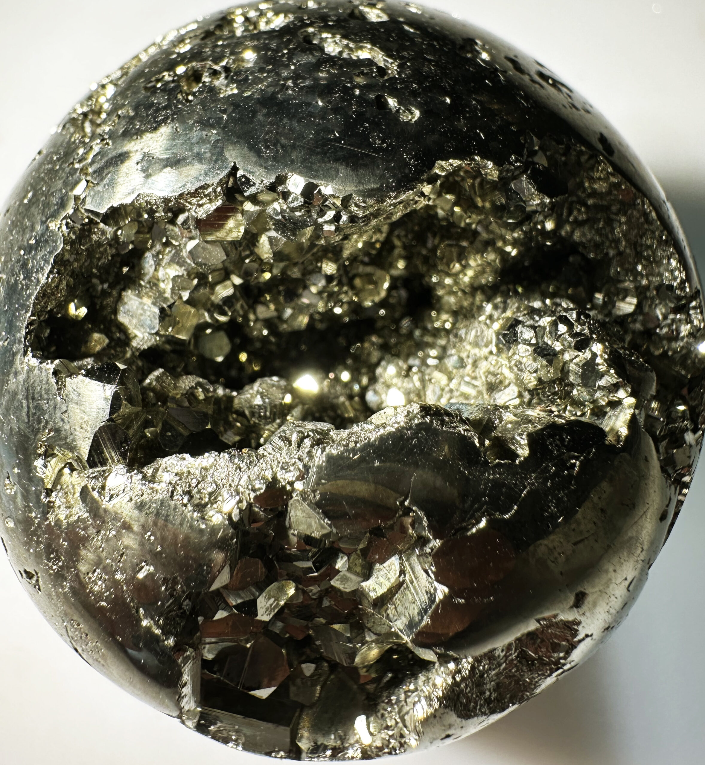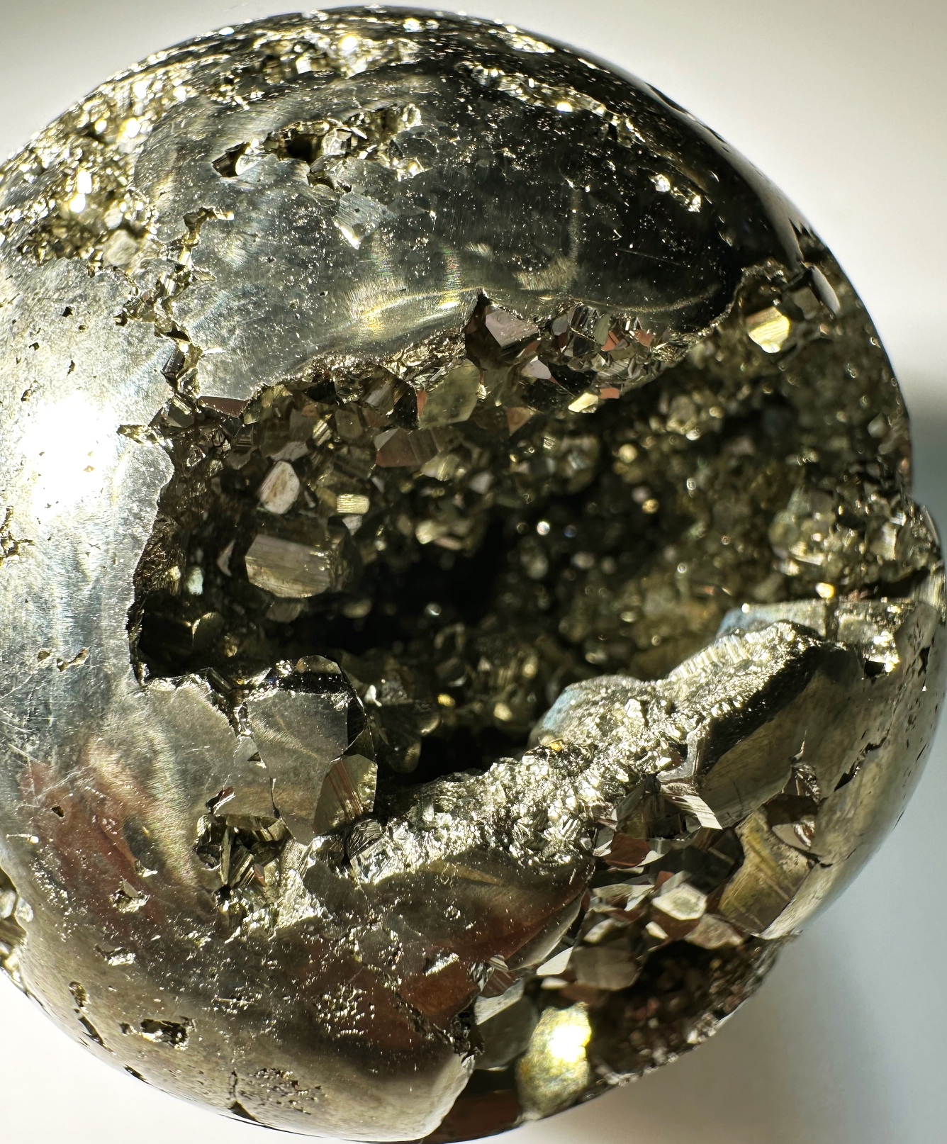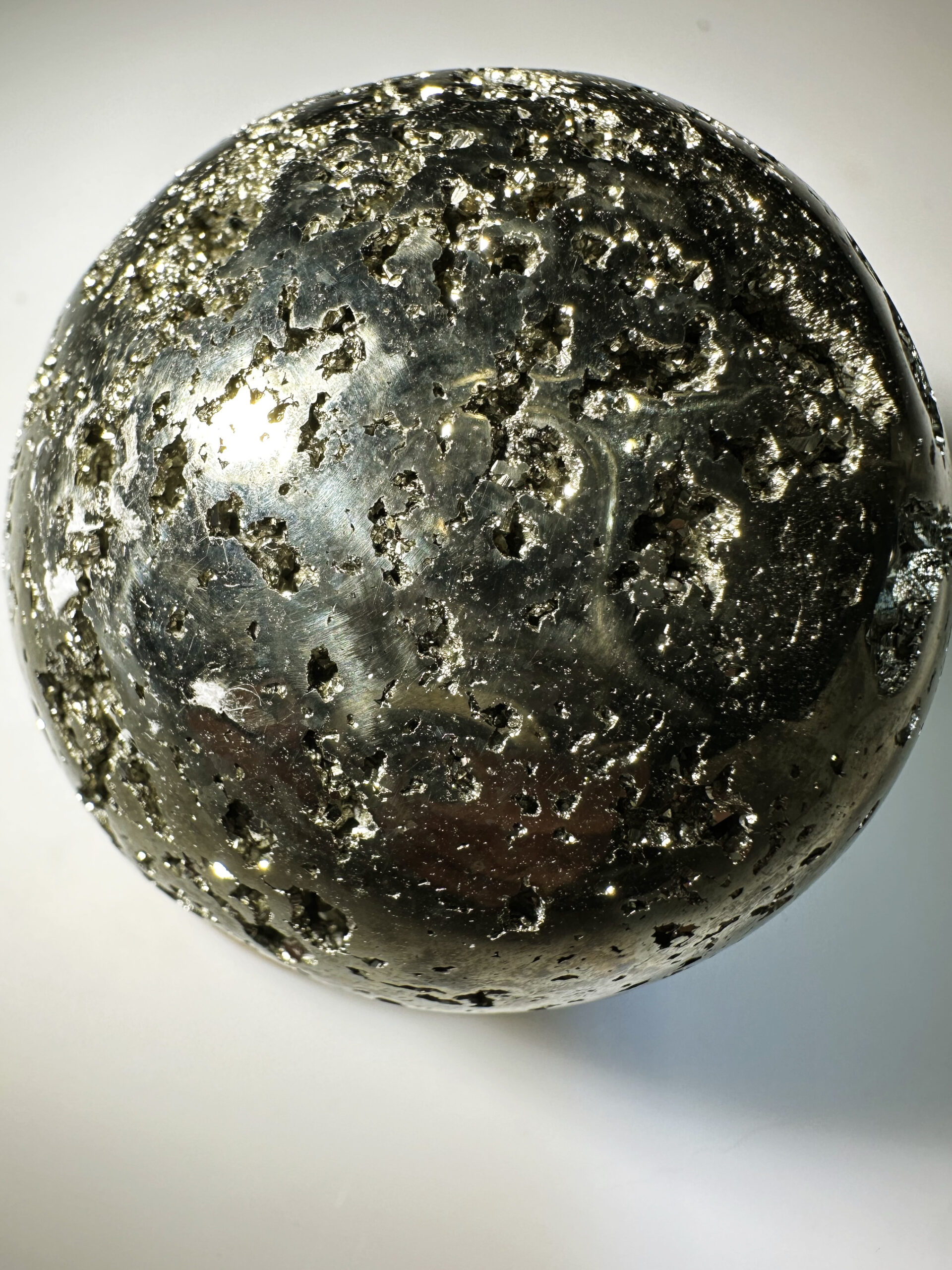 Descrizione: pirite lavorata a sfera, cristalli lucentissimi e ben formati