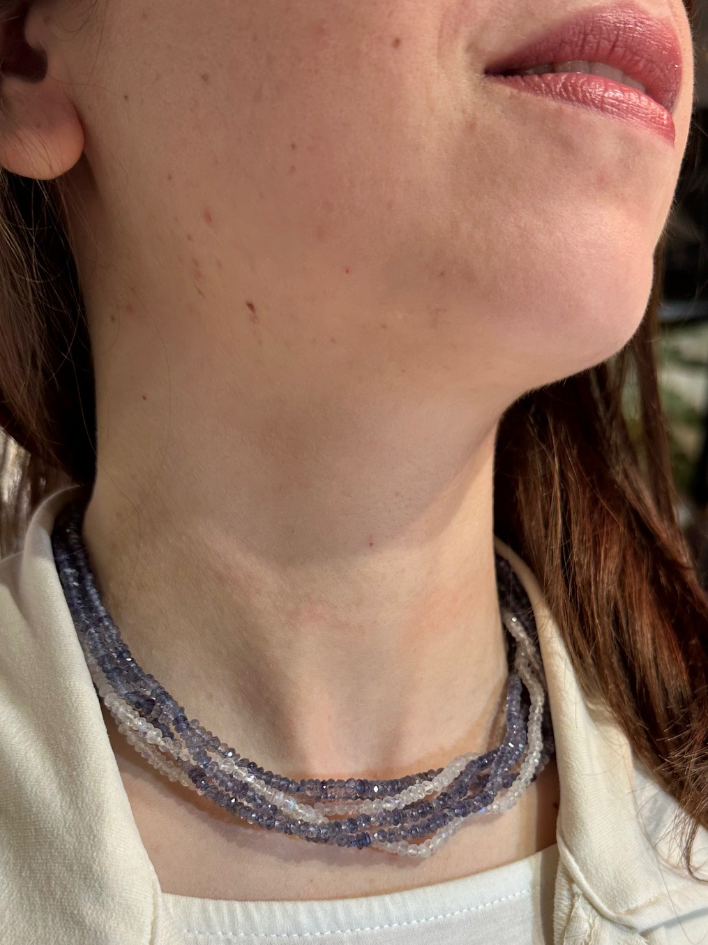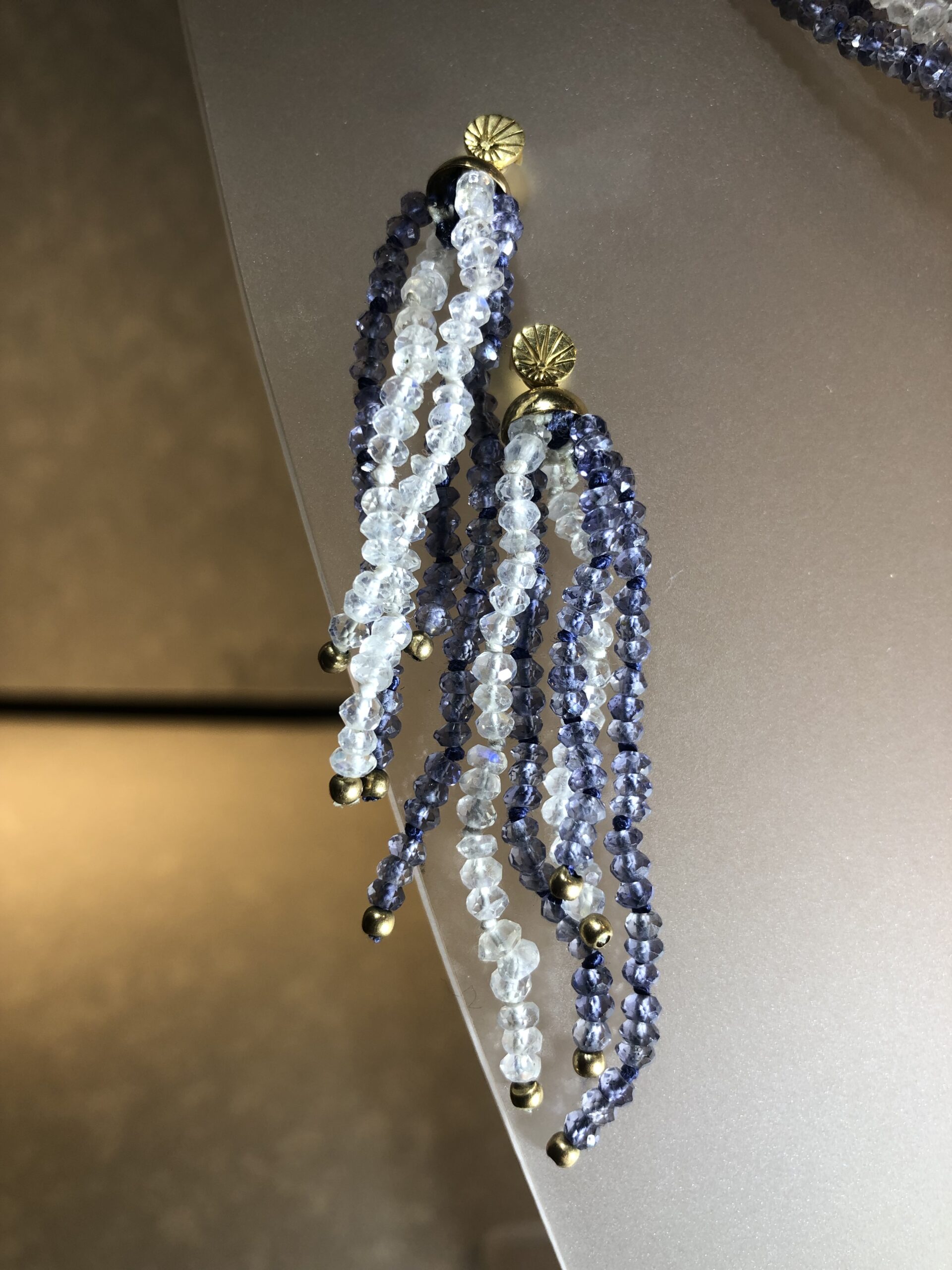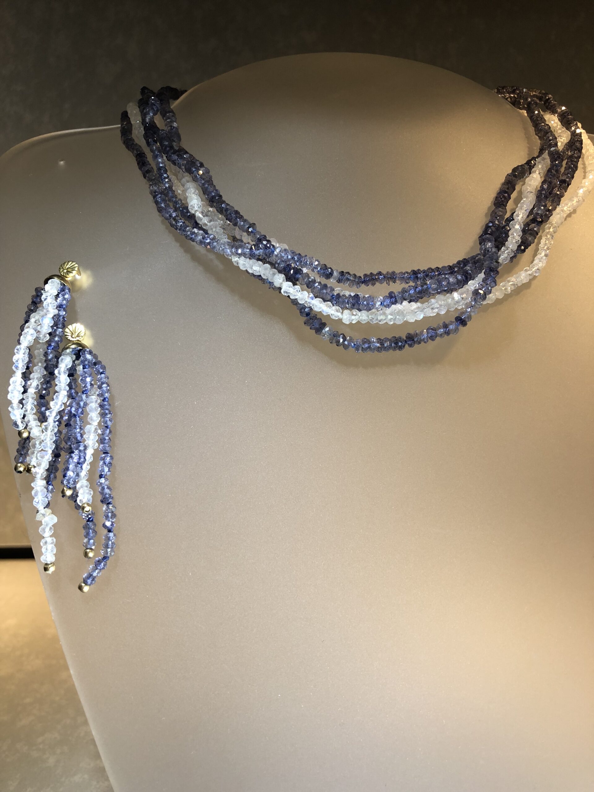 Torchon di iolite e pietra di luna e chiusura oro 750‰. Disponibili anche gli orecchini con un costo a parte