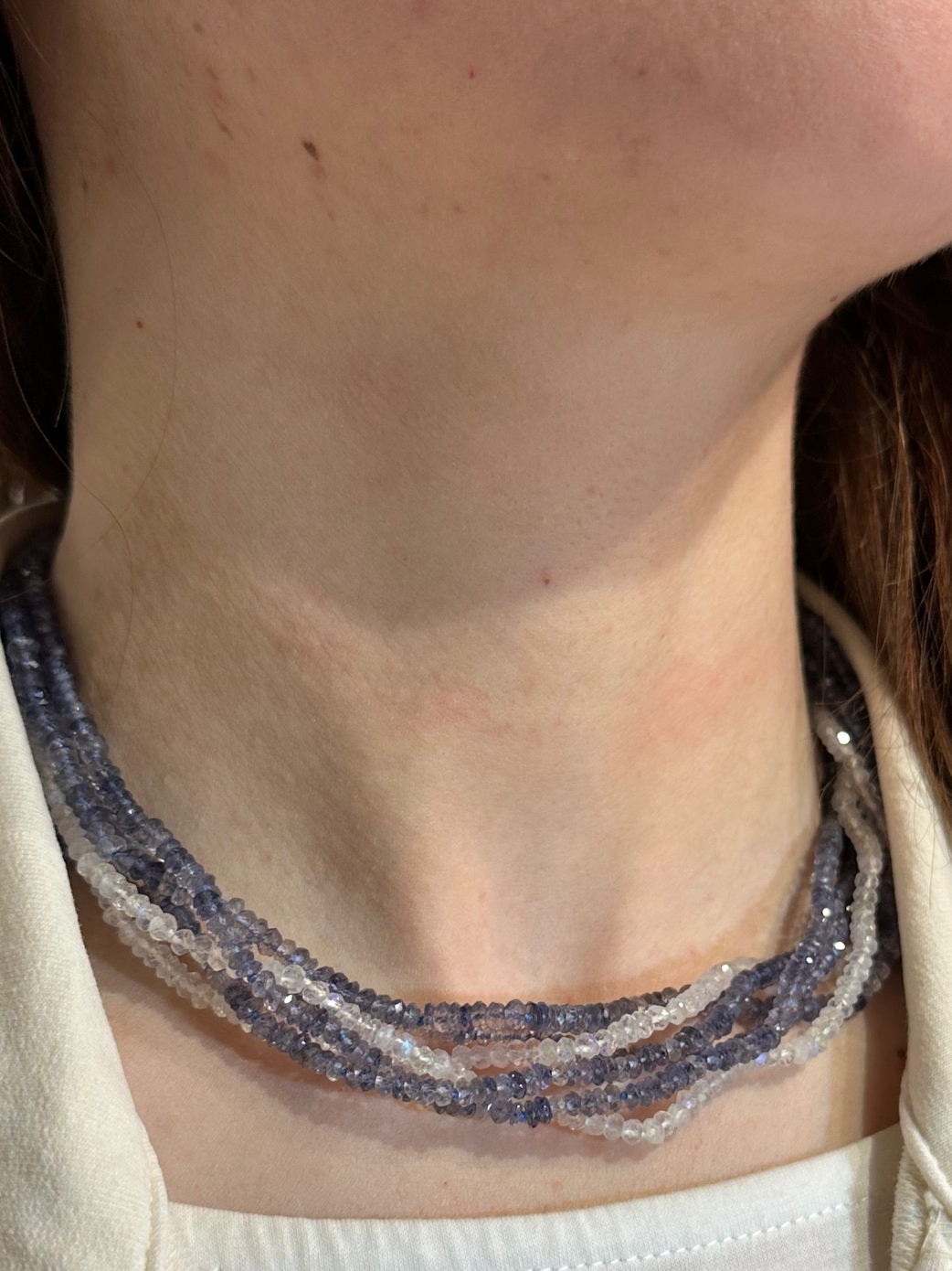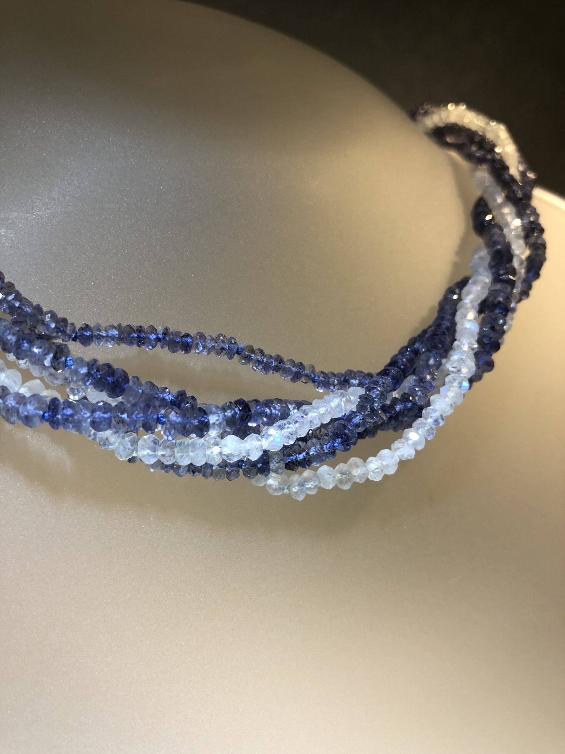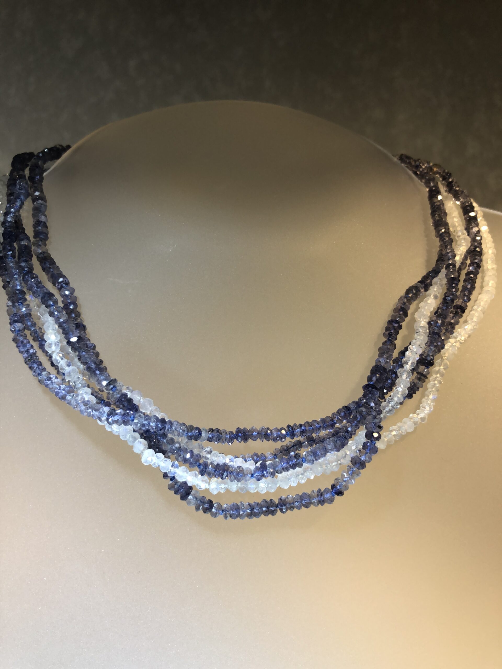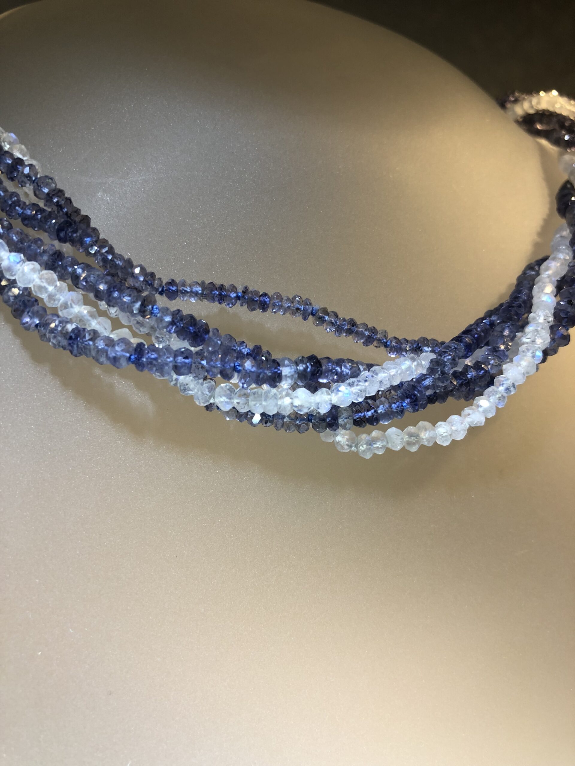 Torchon di iolite e pietra di luna e chiusura oro 750‰. Disponibili anche gli orecchini con un costo a parte