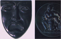A small onyx mask, clearly Neapolitan art. The cry of this traditional face, is amplified by the absence of all colors. Zodiac sign, engraved one hundred years ago on a dark semi-transparent quartz plate.